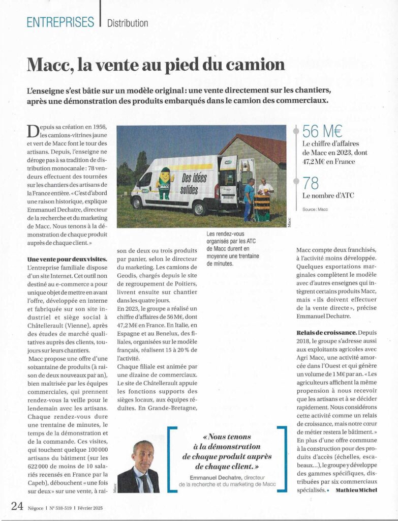 L’azienda di famiglia ha un sito web. Questo strumento, non destinato all’e-commerce, ha il solo scopo di mettere in evidenza l’offerta, sviluppata internamente e realizzata nel proprio sito industriale e sede centrale a Châtellerault (Vienna), dopo studi di mercato qualitativi con i clienti, sempre nei loro cantieri. MACC offre una gamma di circa sessanta prodotti (due novità all’anno), ben controllati dai team di vendita che prendono appuntamento il giorno prima per il giorno successivo con gli artigiani. Ogni incontro dura circa trenta minuti, il tempo della dimostrazione e dell’ordine. Queste visite, che riguardano circa 100.000 artigiani edili (sui 622.000 con meno di 10 dipendenti individuati in Francia da Capeb), si traducono “una volta su due” in una vendita, al ritmo di due o tre prodotti per paniere, secondo il direttore del marketing. I camion GEODIS, caricati dal sito di raggruppamento di Poitiers, vengono poi consegnati ai cantieri entro quattro giorni.